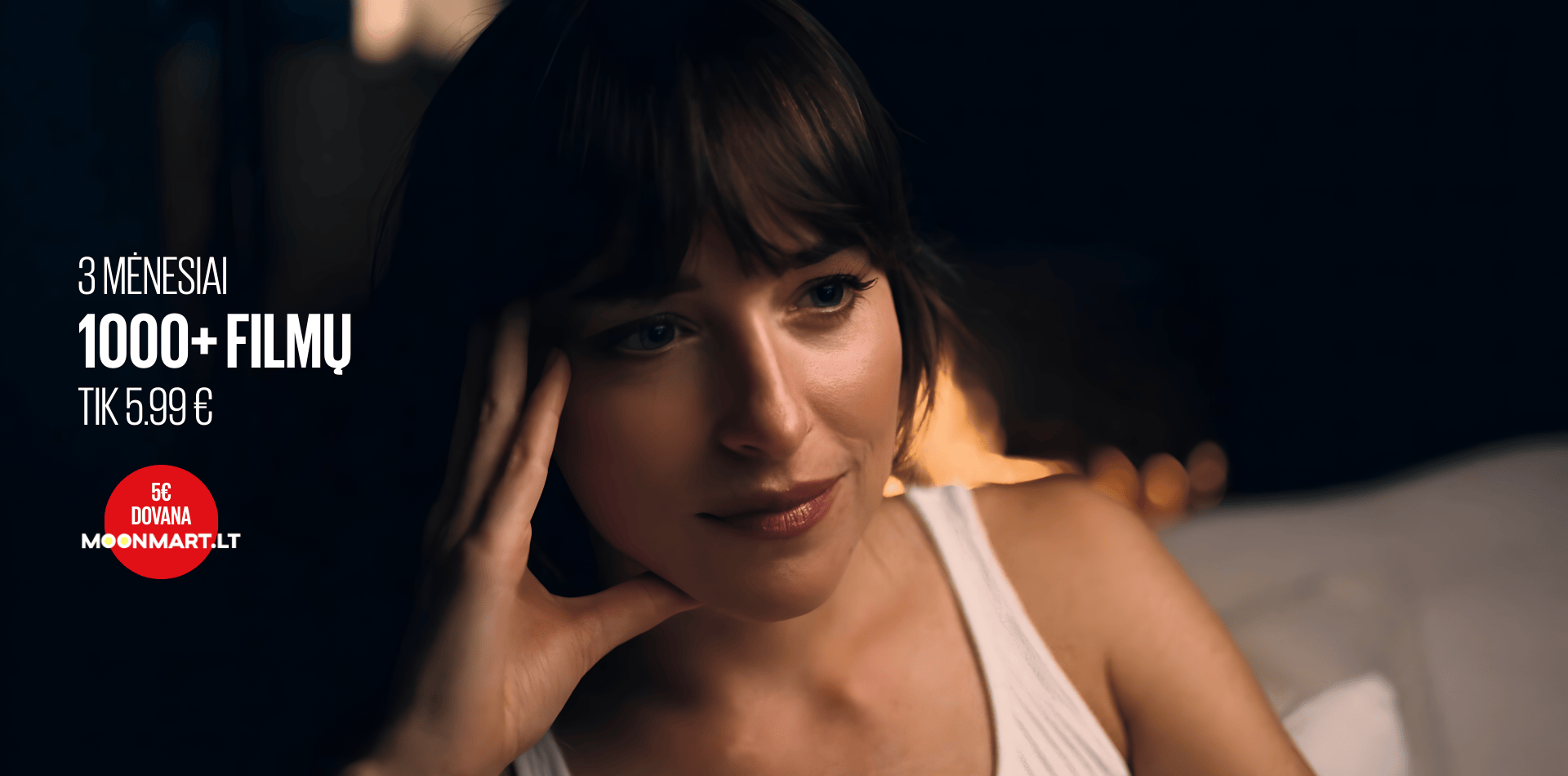 Akcijos laikotarpiu nuo 2026 m. vasario 19 d. iki 2026 m. kovo 13 d., užsisakius bet kurį ŽMONĖS Cinema planą, dovanojame 5 € nuolaidą apsipirkimui MOONMART.LT, perkant už 39 € ar daugiau. Nuolaidos kodas bus atsiųstas el. paštu po sėkmingo plano įsigijimo. Kodas galioja iki 2026 m. kovo 13 d. ir gali būti panaudotas vieną kartą pagal MOONMART.LT taikomas sąlygas. Akcija skirta naujiems ir esamiems ŽMONĖS Cinema vartotojams, įsigijusiems bet kurį platformos planą akcijos laikotarpiu.
